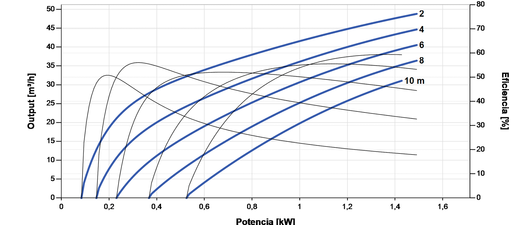 - Caudal máx. 49 m³/h y altura máx. 10 m (pozos de 6”).