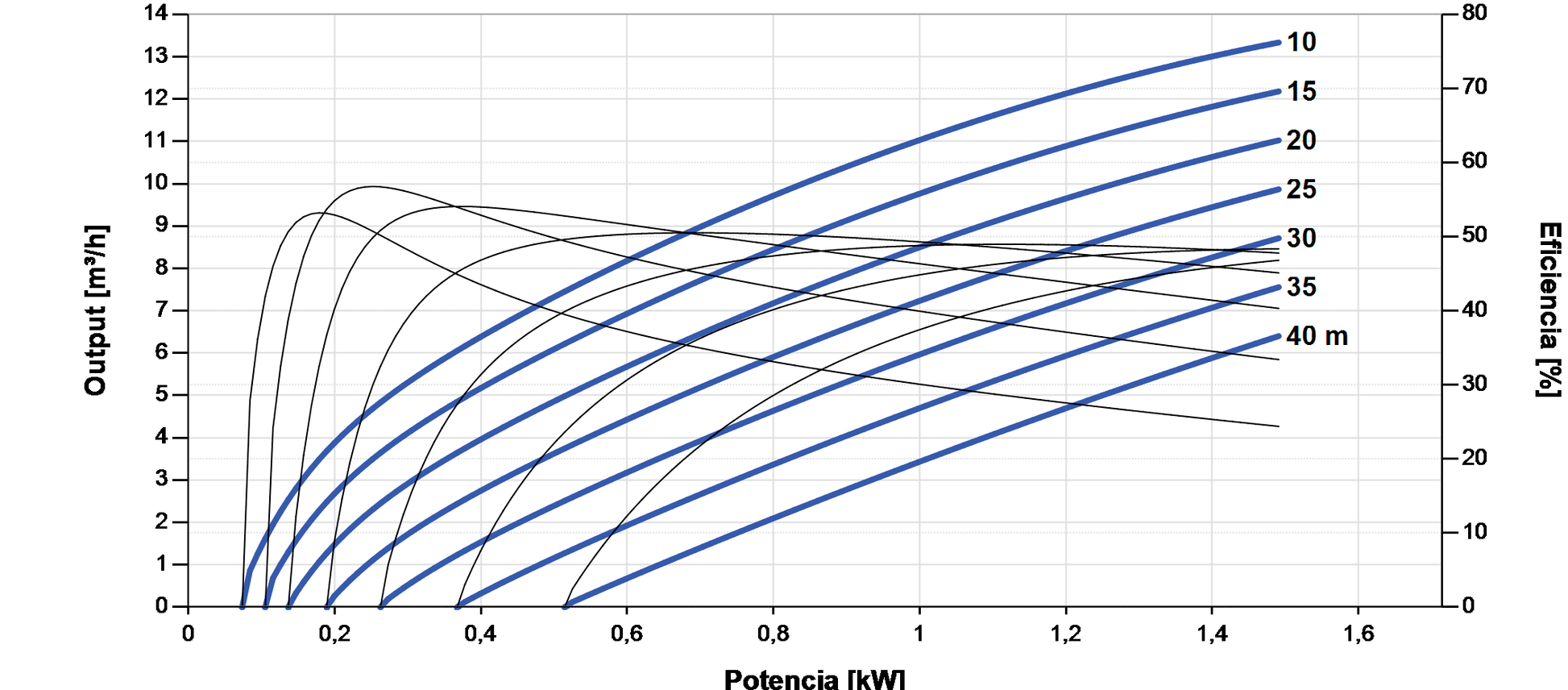 - Prestaciones: 13 m³/h de caudal y 40 m de altura (pozos de 4").