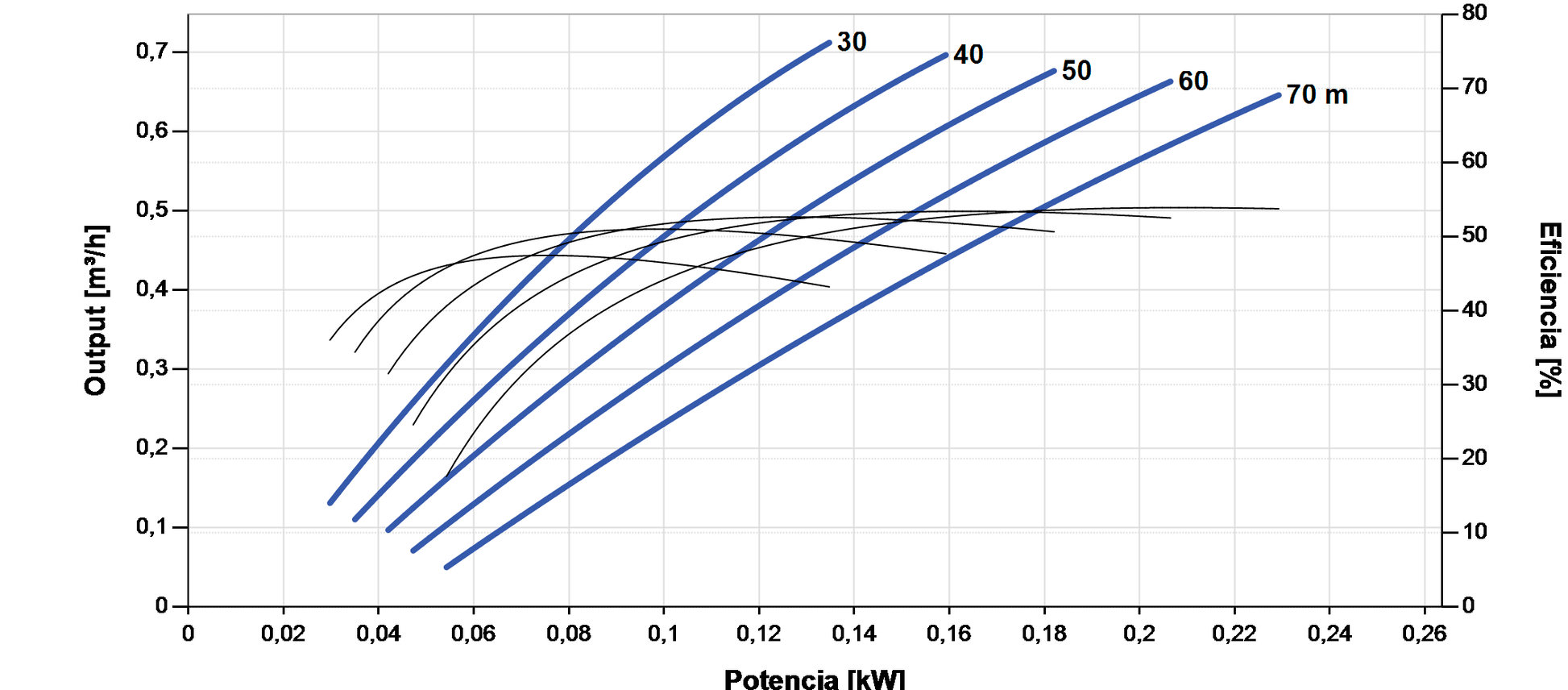 | Altura / Caudal de referencia | Hasta 70 m / 0,71 m³/h |