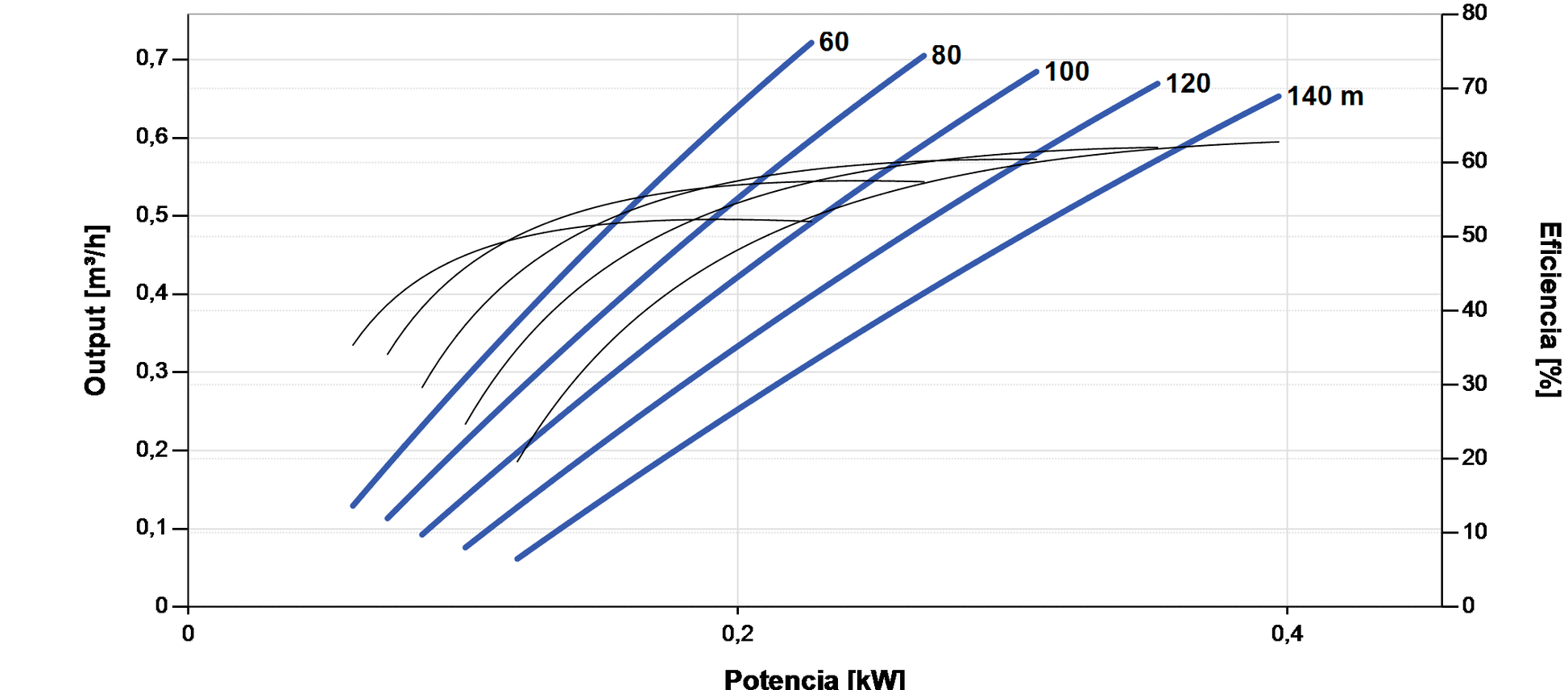 - Altura máxima de referencia 140 m y caudal hasta 0,72 m³/h (pozos profundos).