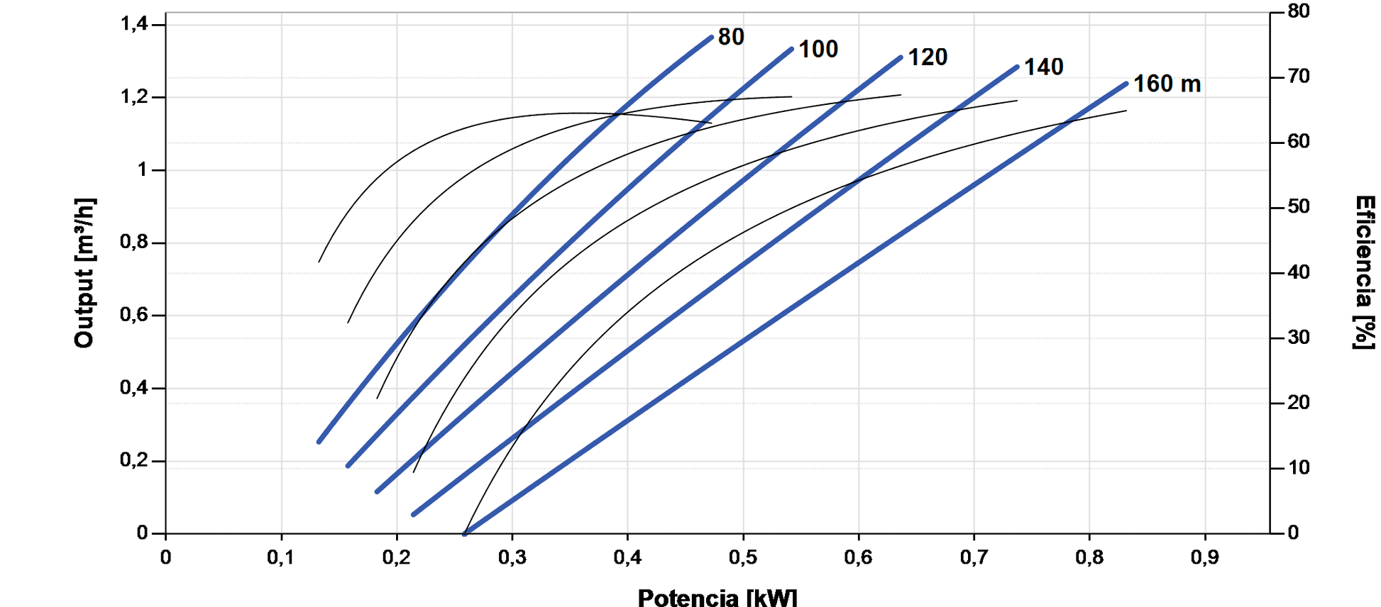 - Caudal/Altura: hasta 1,4 m³/h y 160 m en pozos de 4”.