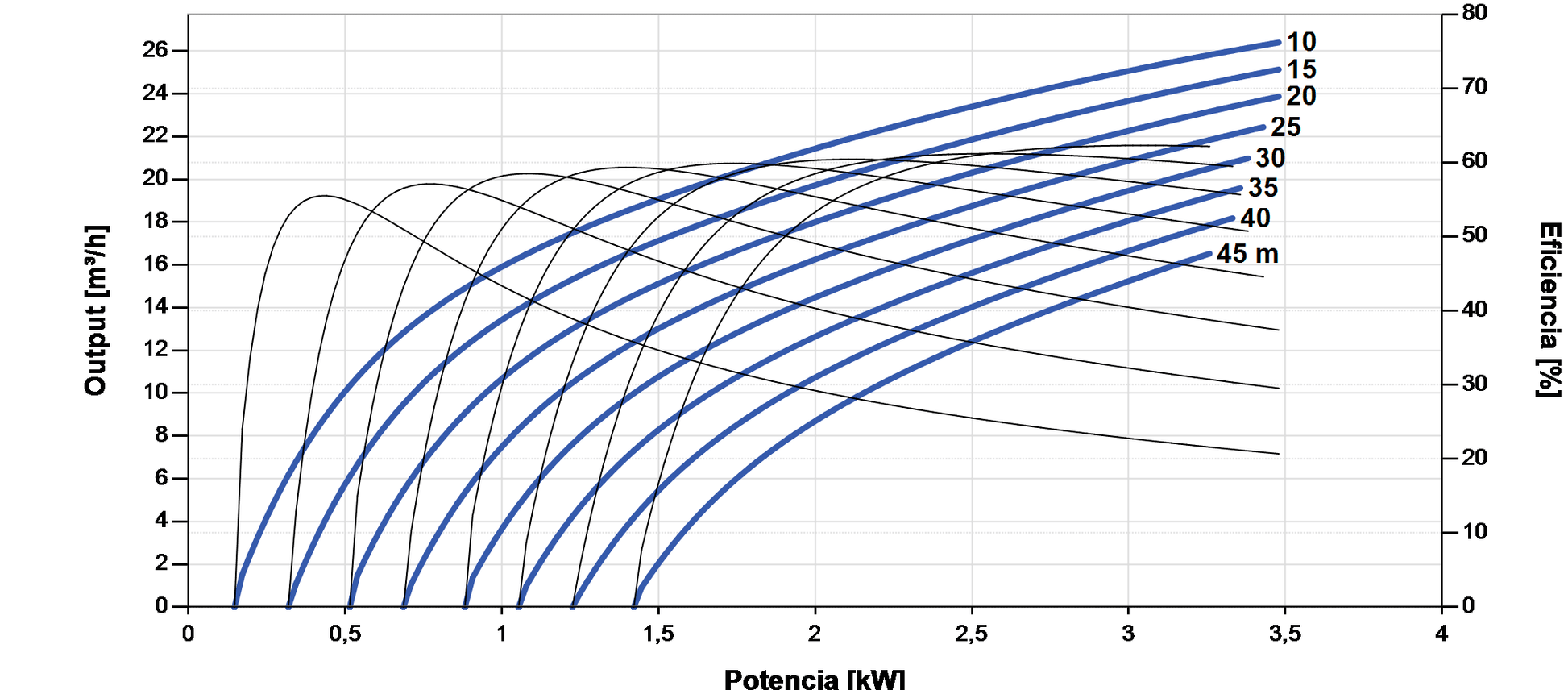 - Caudal máx. 26 m³/h y altura máx. 45 m.