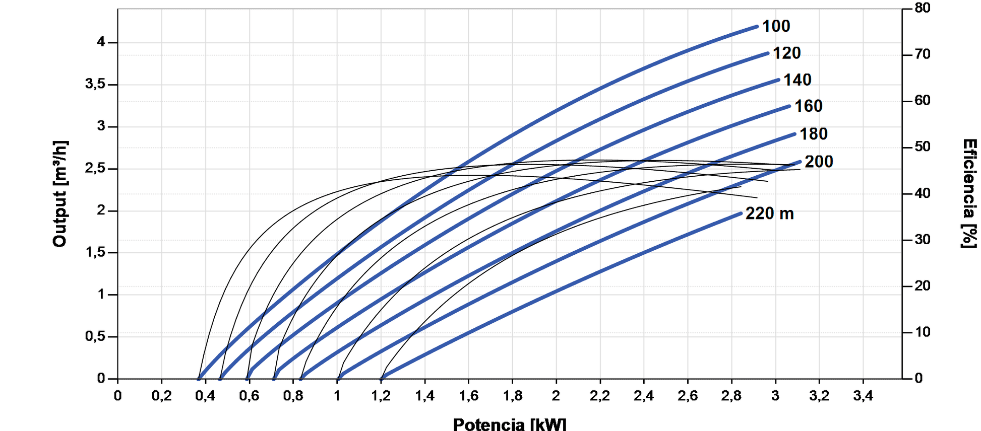 - Prestaciones del conjunto: 4,2 m³/h y 220 m (pozos profundos y alta presión).