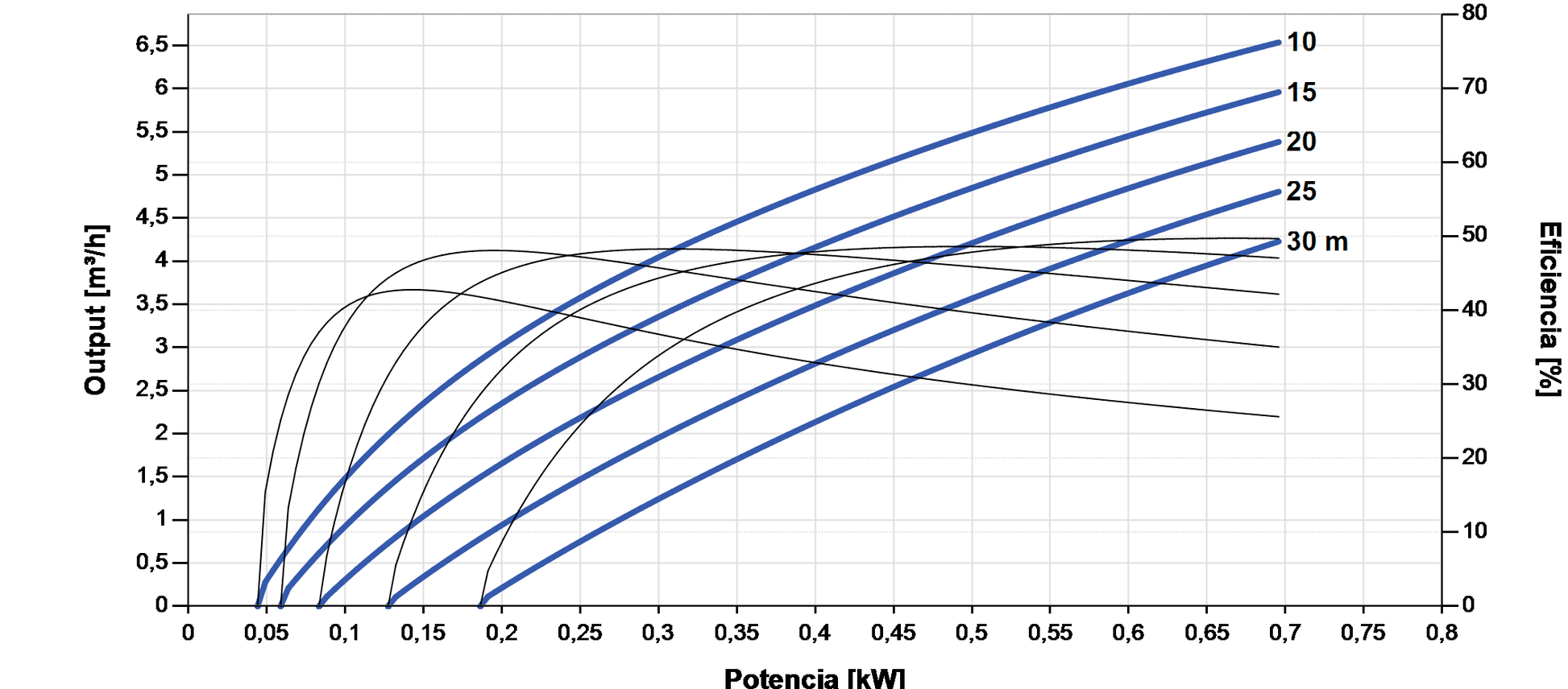 - Prestaciones de referencia: 6,5 m³/h y 30 m (pozos de 4").