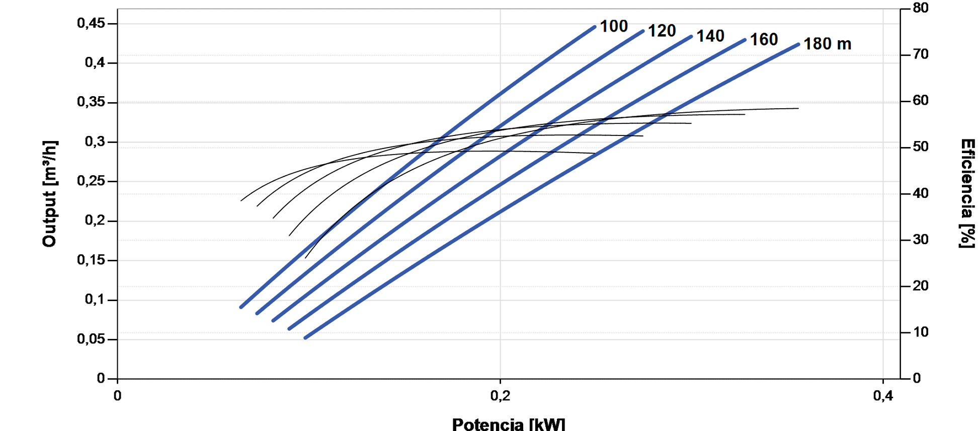 - Altura de referencia hasta 120 m con caudal de 0,5 m³/h (gran elevación con consumo moderado).