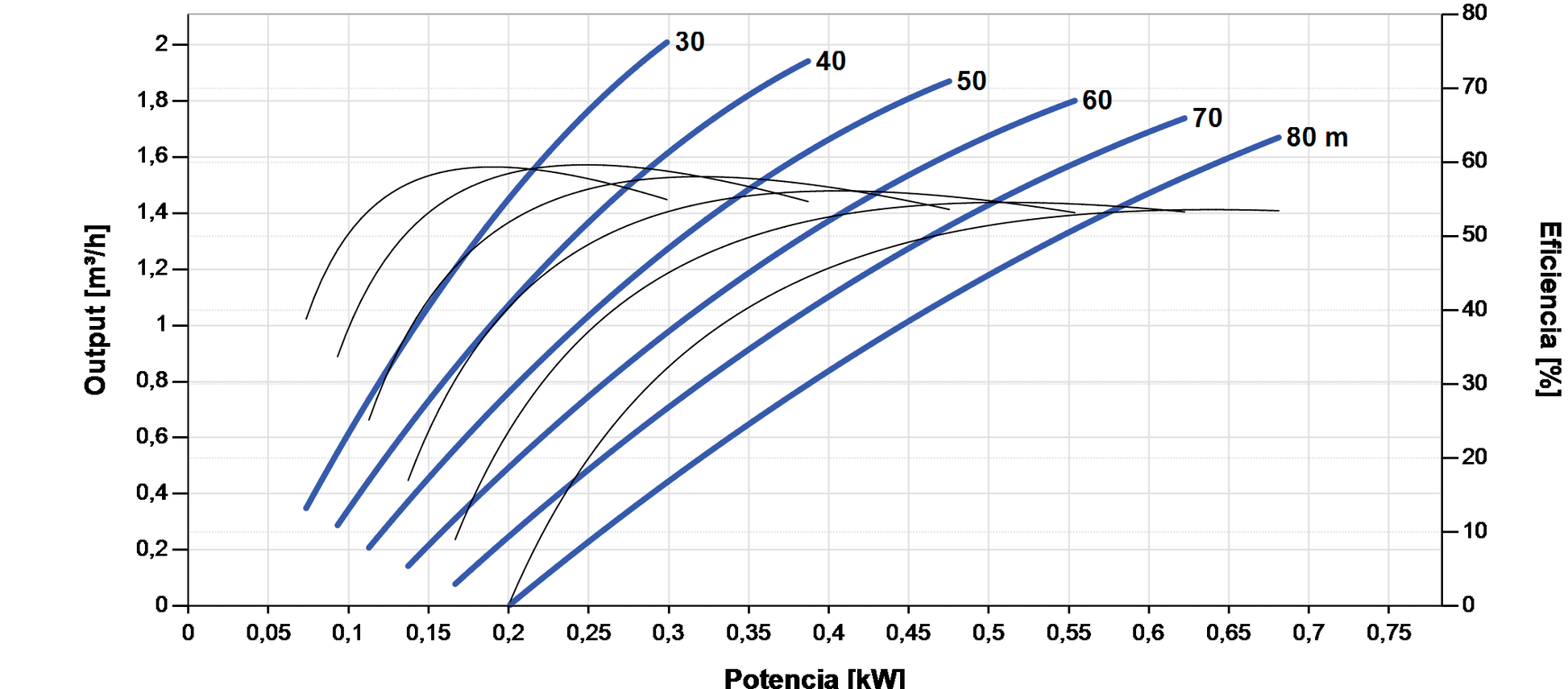 - Caudal/Altura: hasta 2,0 m³/h y 80 m en pozos de 4”.