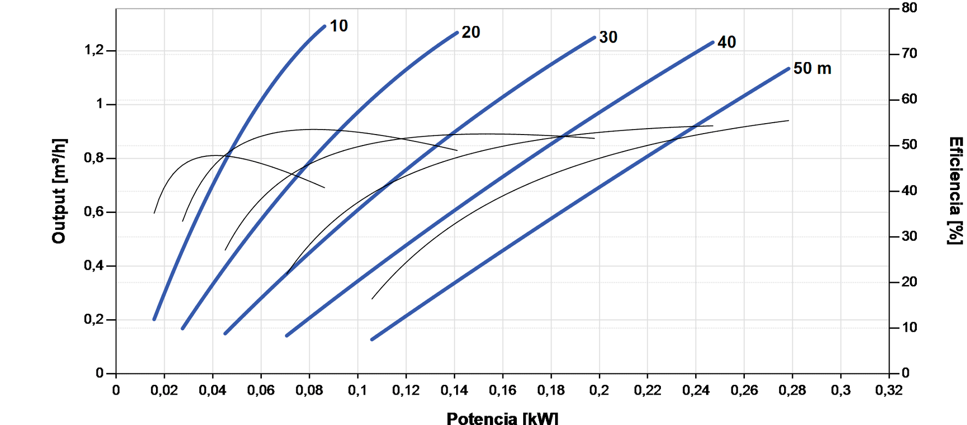 - Caudal máximo 1,3 m³/h y altura manométrica hasta 50 m para líneas medianas y depósitos a cota moderada.