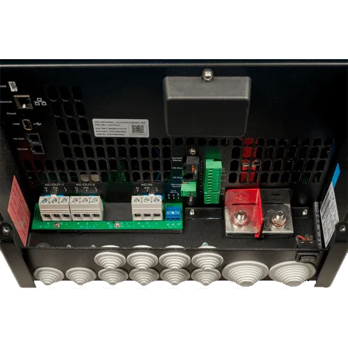 - Integración 3-en-1: inversor/cargador 5 kVA, MPPT 250/100 y dispositivo GX con pantalla y conectividad.